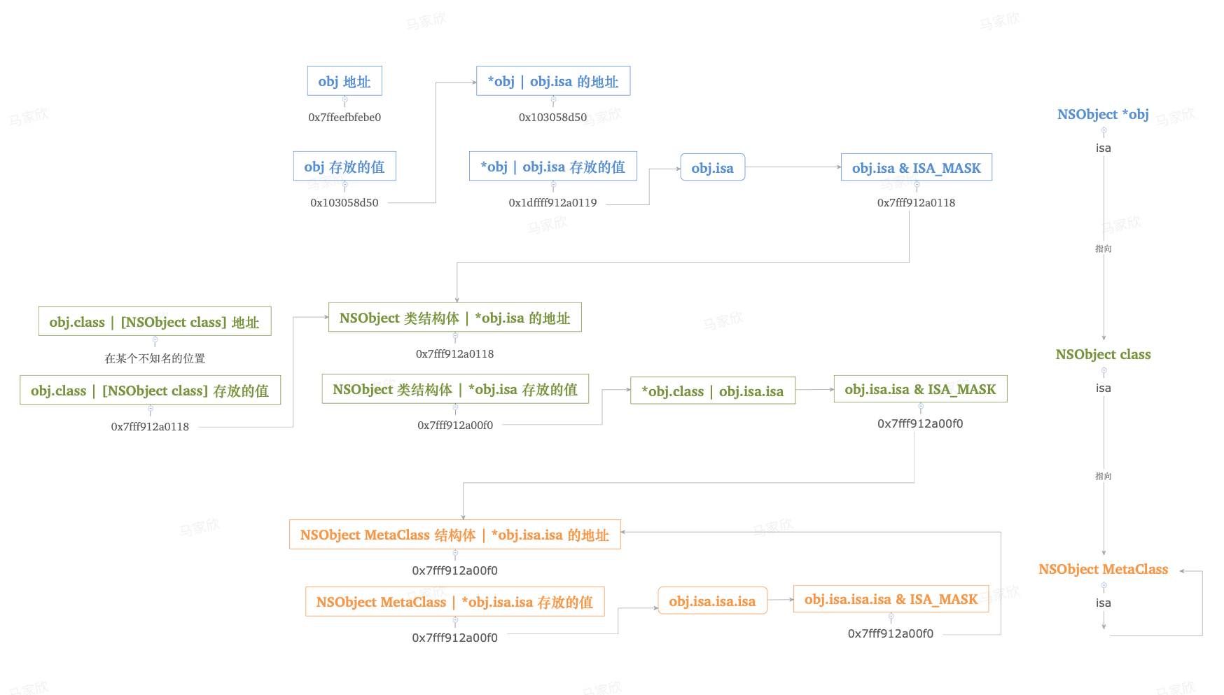 *obj.class指向等同于objc.class.isa等同于obj.isa.isa - 上面的地址, 都为
