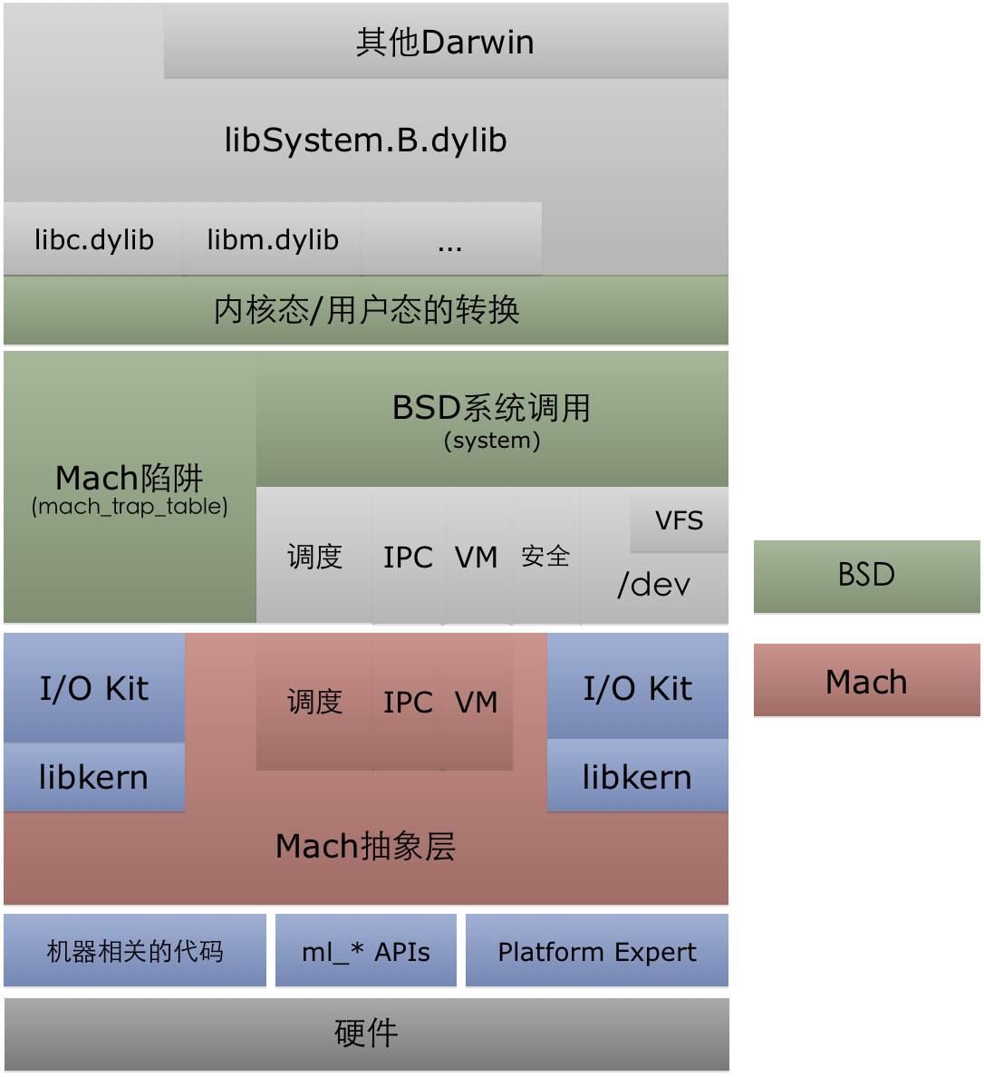 下图可以看到很多熟悉的名词, 而最下一层的 Kernel Mach 既上面提到的 Mach, 具体看可看官方文档