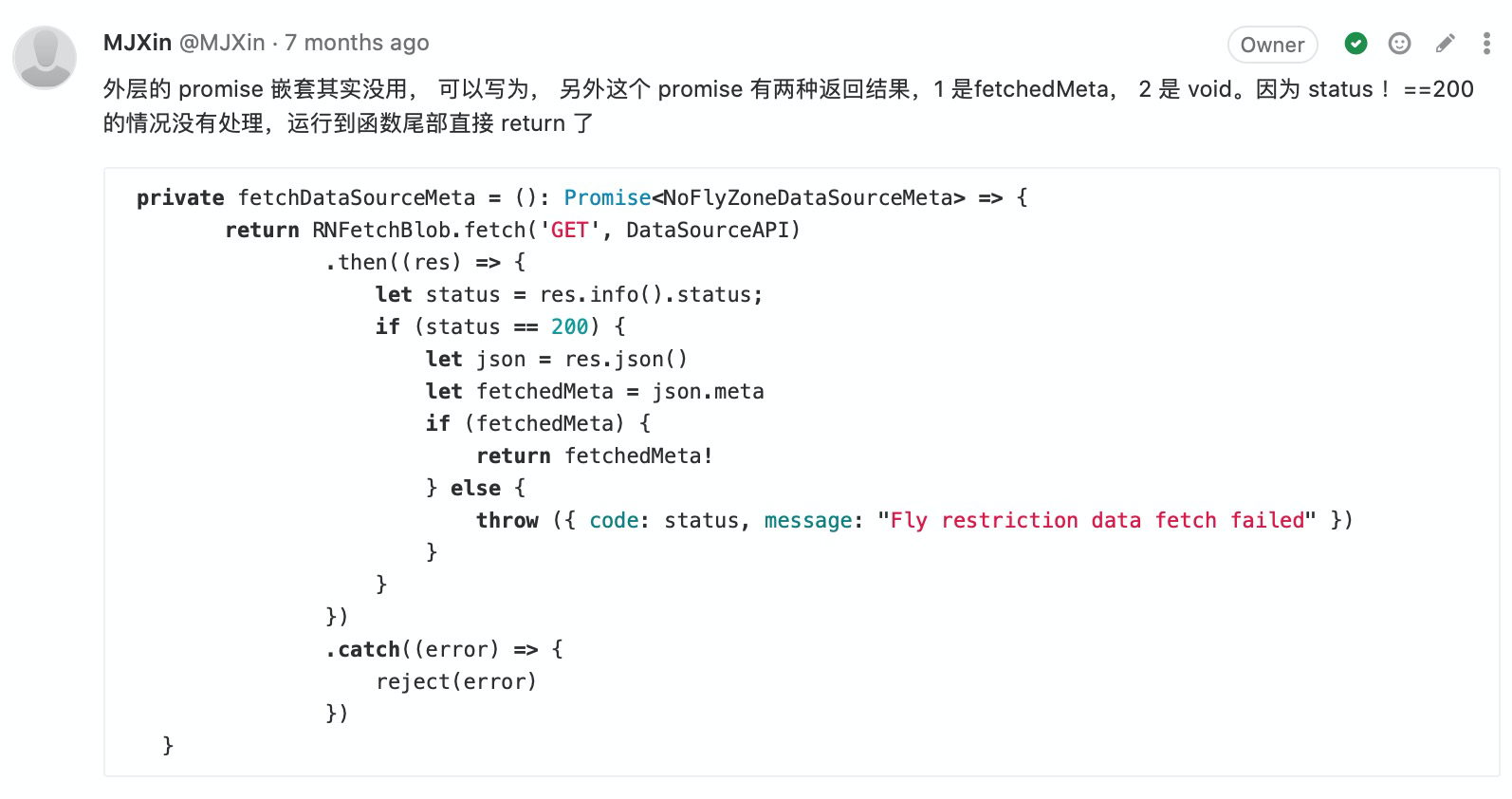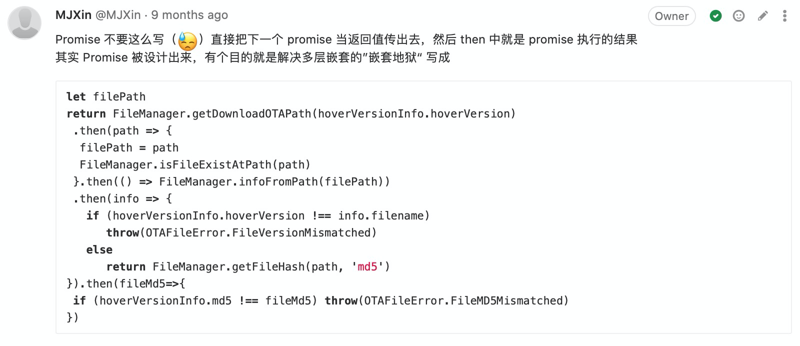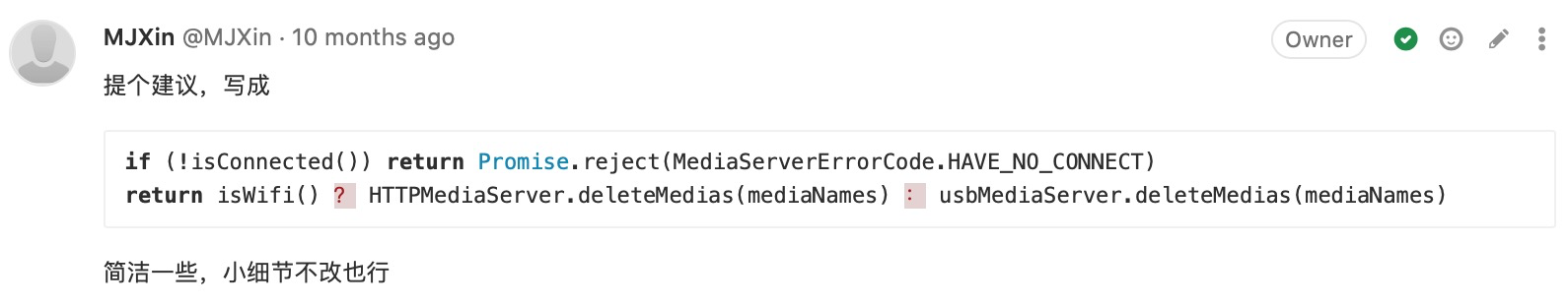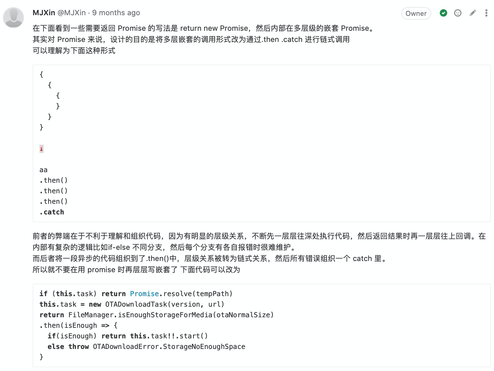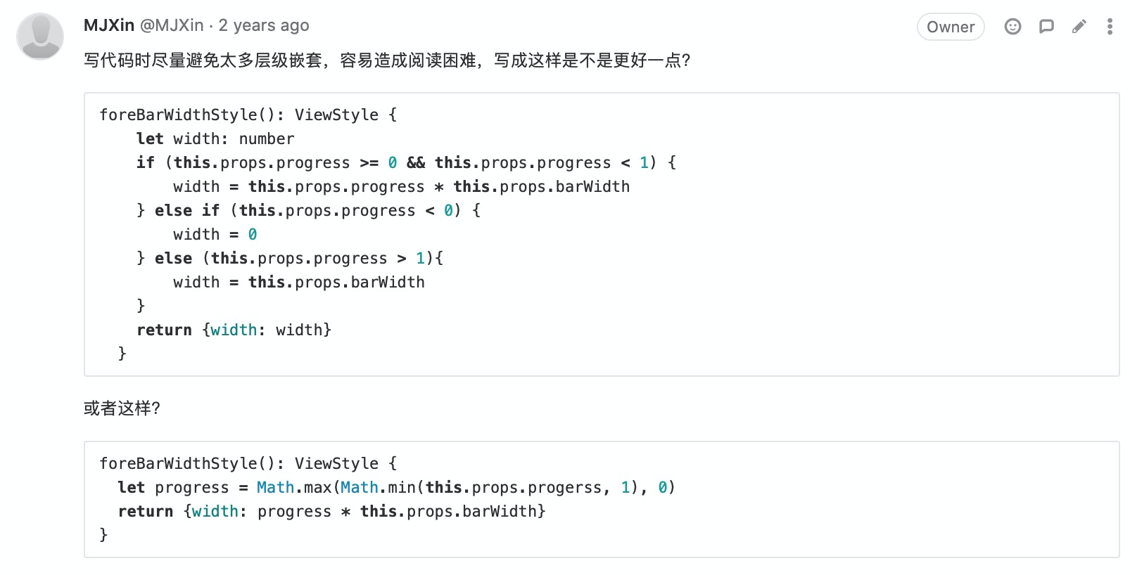 附录-CodeReview:(我关注的)写法有优化空间 48 图 工程专题 CodeReview 附录 Jul 05, 2020 0 views 避免多层级嵌套及善用 Promise 用官方提倡的方式简化代码 用 Key-Value 代替 Switch-Case 不留无用代码 PREVIOUS附录-CodeReview:(我关注的)提高代码可维护性, 代码统一性 23 图NEXT附录-CodeReview:(我关注的)码不达意 7 图