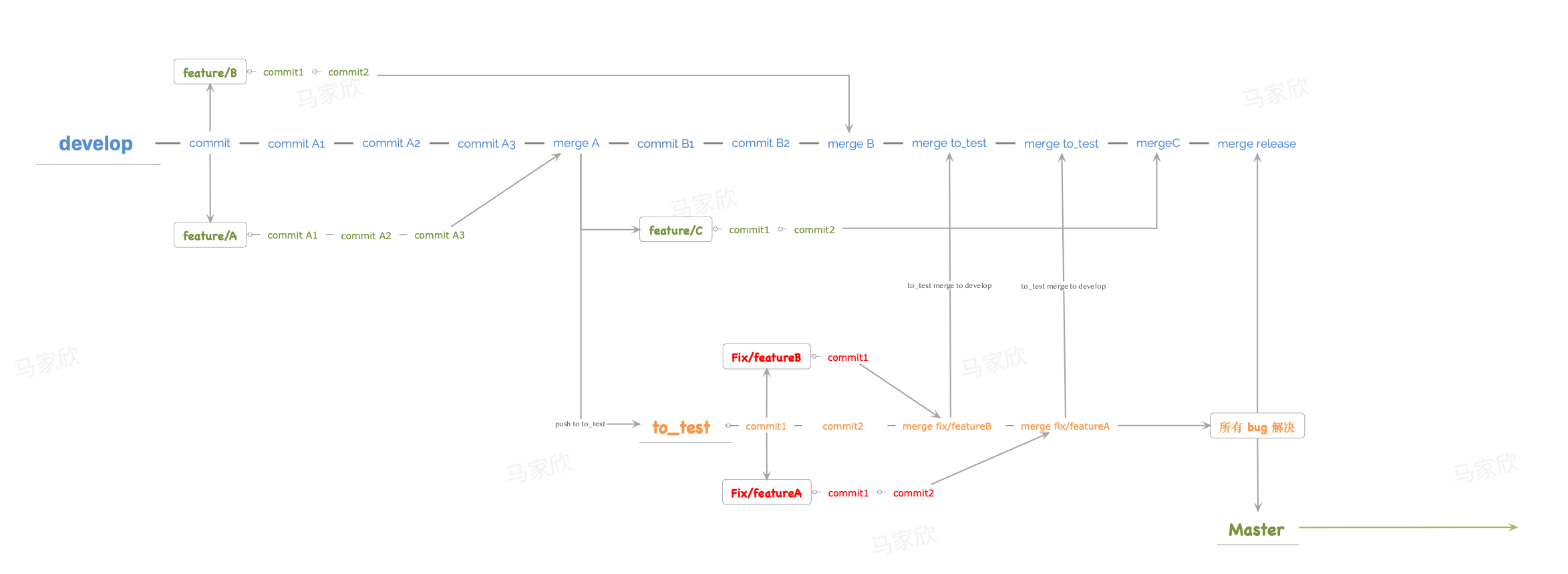 ps2. develop 需要定期同步 to_test 代码,保持两边代码同步;to_test 不允许合并 develop 代码, 避免在提测分支中引入新功能