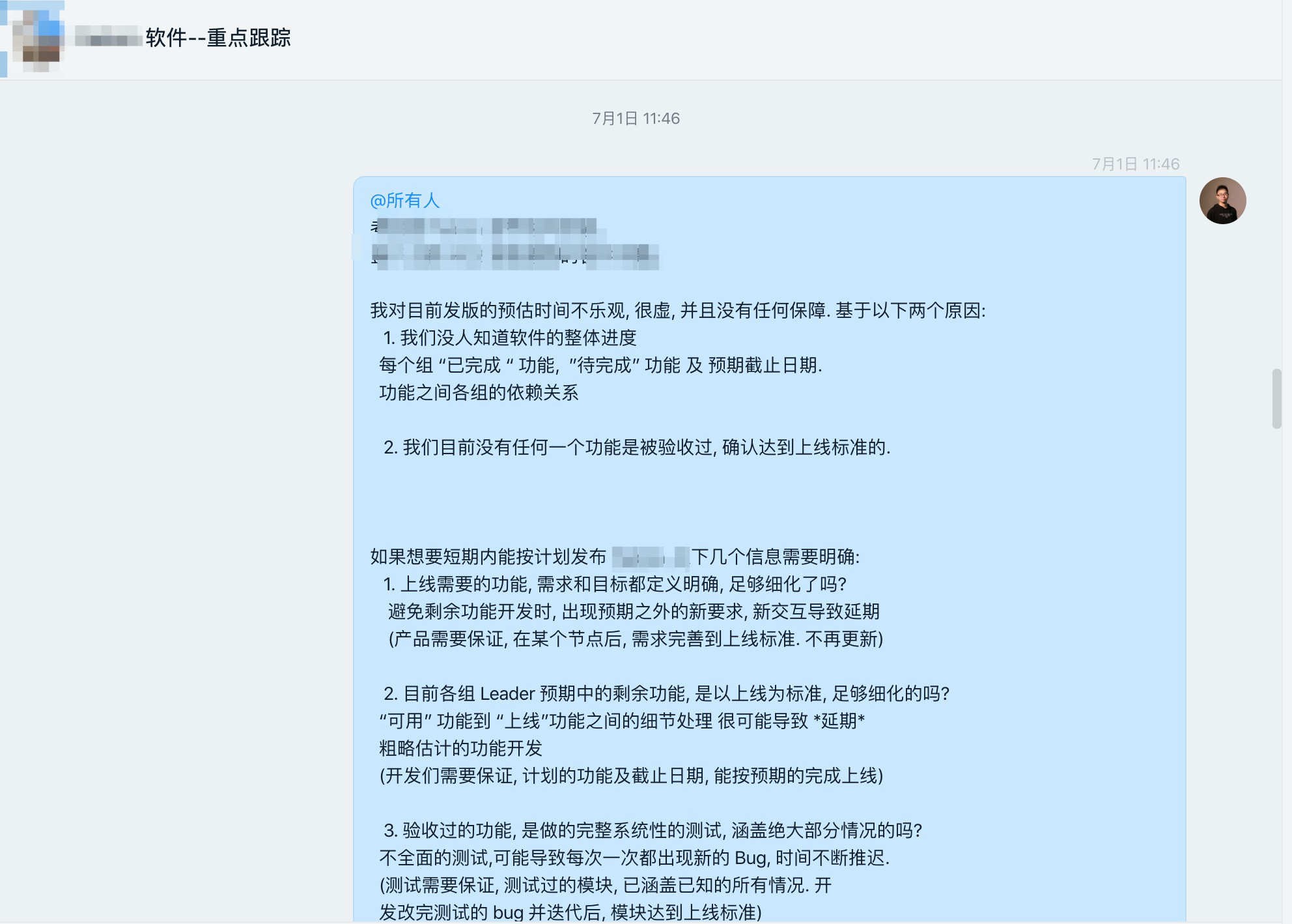 1. 我们没人知道软件的整体进度 每个组 “已完成 “ 功能, ”待完成” 功能 及 预期截止日期.