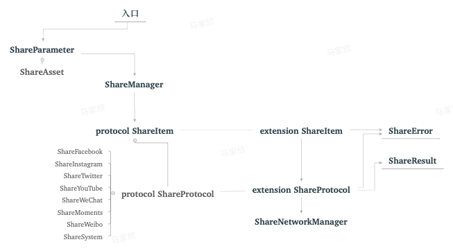 基于这样的流程:提供了描述流程的协议 protocol ShareItem (分享能力判断, 认证,分享)