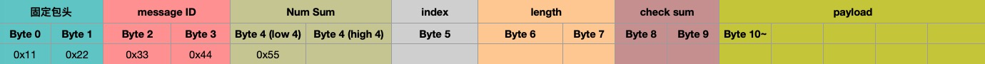 上图除了 payload 外,其他的header,length,numsum,index,check sum 是很多数据协议里常见的部分。