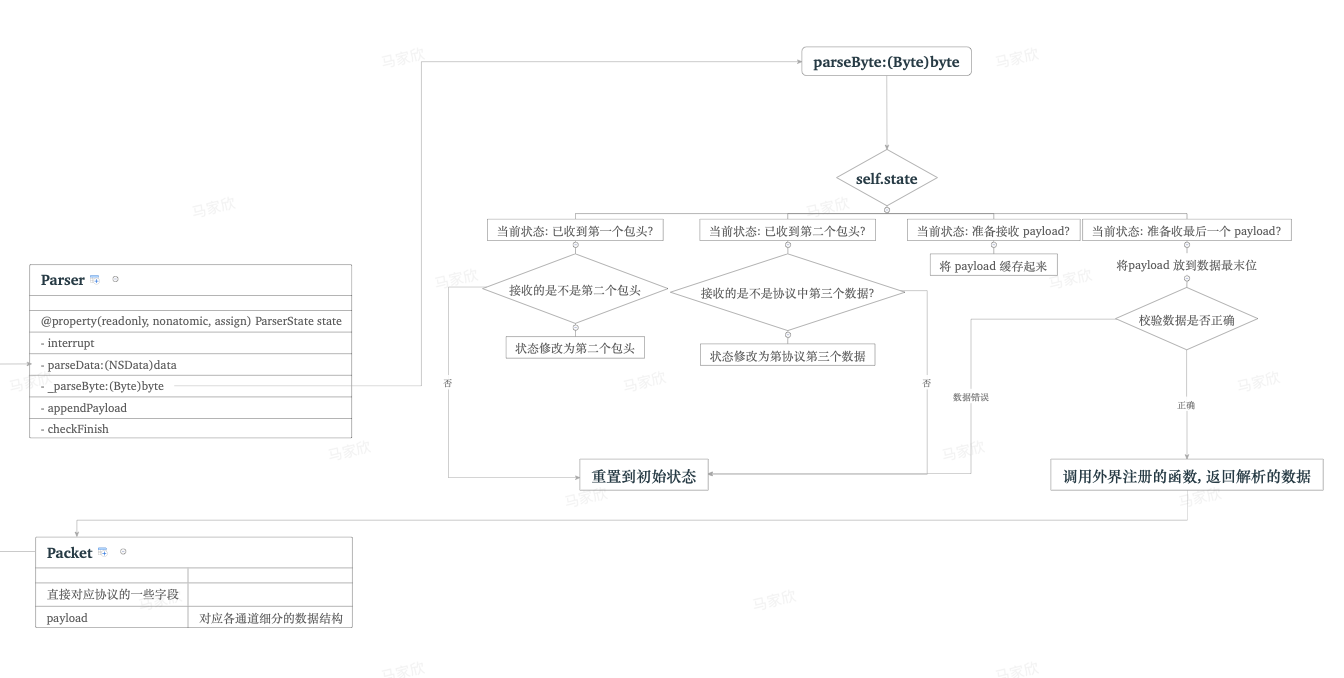- 内部用状态机实现, 来一个 Byte 改一个状态, 直到拼凑出完整的一包数据, 对外输出