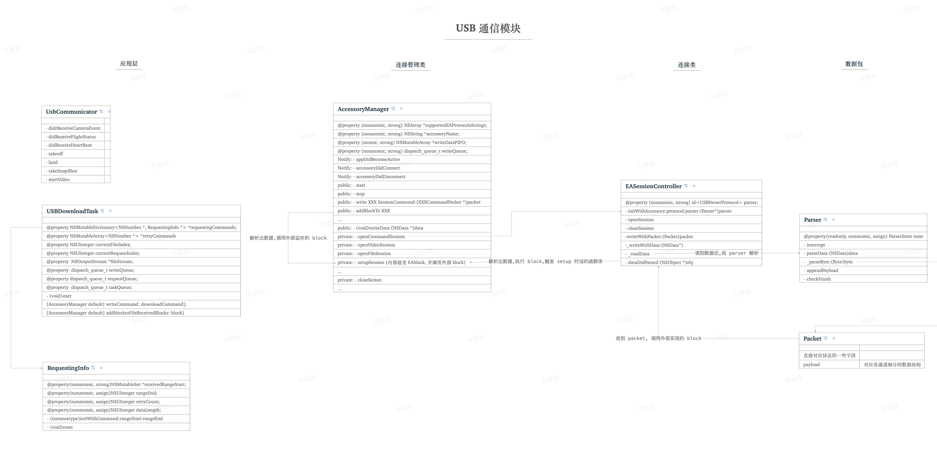 EASessionController主要是对系统 API 的调用, 包含创EASession,扔进Runloop,写,读,调用Parser解析Packet是个包容器,字段就等于协议的字段。 协议长什么样不了解的话,可以看前情提要AccessoryManager管理类, 外界实质的操作接口,提供读解析成对象的数据或者写一个对象的接口, 内部做处理。看上图就够了